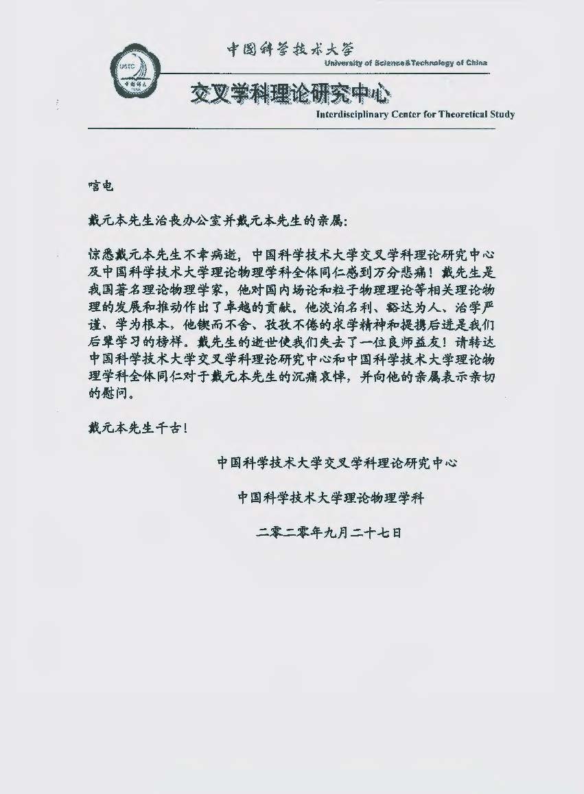 中国科学技术大学交叉学科理论研究中心唁电