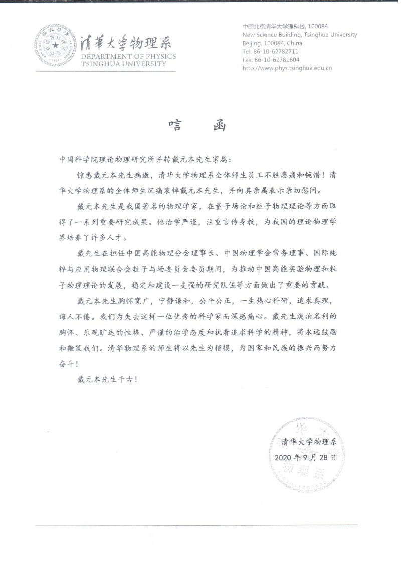 清华大学物理系唁电